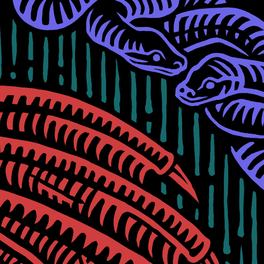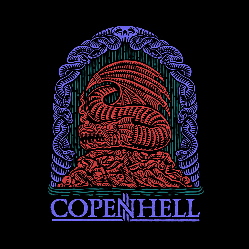 Merchandise artwork for Copenehll 2023 - a metal music festival in Copenhagen. The imagery was inspired by Náströnd, a hall in Norse hell.